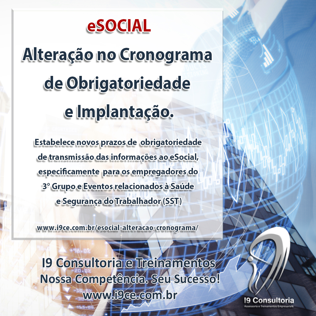 Foi publicada no DOU, dia 05.07.2019, a Portaria SPREV/ME n° 716/2019, a qual revoga a Resolução CDES n° 002/2016 e estabelece novos prazos de obrigatoriedade de transmissão das informações ao eSocial, especificamente para os empregadores do 3° Grupo e Eventos relacionados à Saúde e Segurança do Trabalhador (SST).