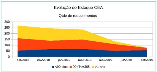 A redução observada no 3º trimestre de 2019 é continuidade de uma trajetória de queda iniciada em setembro de 2018, a qual se intensificou a partir de março/2019. Esse resultado decorre de aperfeiçoamento dos trabalhos em todas as equipes regionais. Ressalta-se também que foram realizados no período redistribuições de requerimentos entre as equipes OEA com a finalidade de equalizar os estoques.