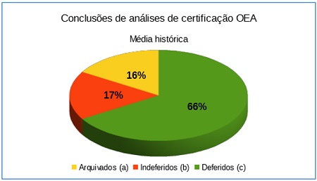 O resultado das conclusões das análises no 3º trimestre de 2019 encontra-se compatível com o padrão histórico de resultado das análises de certificação OEA, ou seja, o esforço para tratar o estoque acumulado não foi baseado em arquivamentos e indeferimentos em quantidade acima da média.