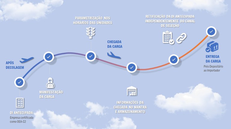 A unidade local de despacho e a unidade local de entrada devem ser a mesma, ou seja, só é permitido registro de despacho antecipado no modal aéreo do exterior até o primeiro aeroporto de chegada em território nacional (voos diretos).