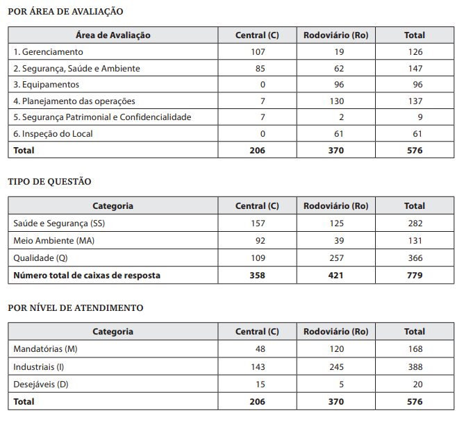 Deve-se notar que, para as questões em que é impossível ou desnecessário fazer uma distinção entre os aspectos de SSMA e Qualidade, apenas a caixa Q está disponível, indicando que: